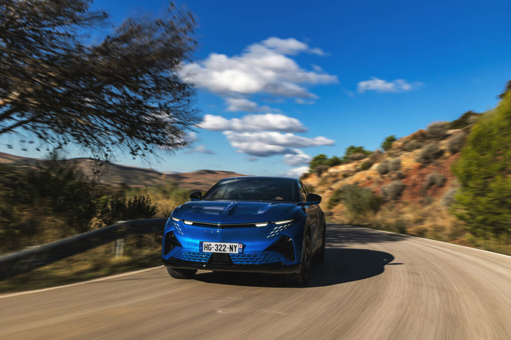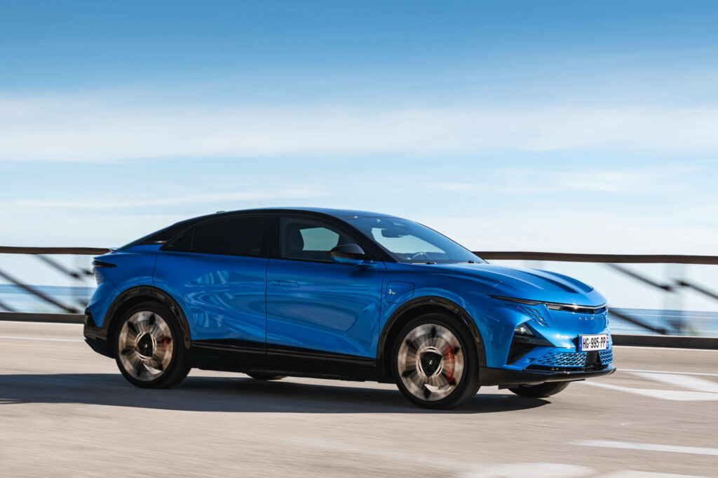 Parmi les grands contributeurs de l’autonomie électrique, l’aérodynamique est soignée dans chaque détail, de la spectaculaire lame du capot sculpté à la jupe arrière. La forme suit la fonction, avec une chute de pavillon selon un angle de 17°, des “flaps” au niveau des roues arrière, des passages d’air guidé au niveau des roues et un angle de 8° pour le diffuseur, inspirés des prototypes Le Mans Daytona h. Un discret spoiler peint en noir intégré à la base de la lunette arrière conclut la liste des éléments aérodynamiques à l’arrière de ce sport fastback. De quoi parfaitement concilier fluidité aérodynamique et élégance. Enfin, un petit easter egg est glissé dans un coin du pare-brise : la silhouette légendaire de l’Alpine A110.