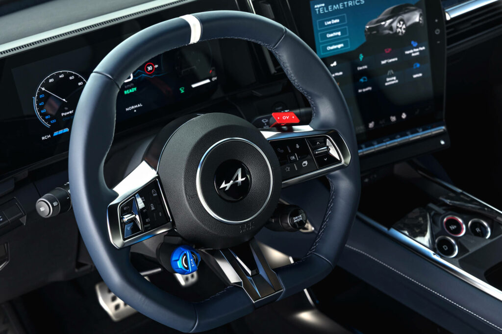 Le poste de conduite est orienté vers le conducteur, qui trouve face à lui des écrans haute définition de 12,3 et 12 pouces aux graphismes le plongeant dans l’univers Alpine. Les commandes physiques de climatisation permettent d’intervenir sur leurs réglages sans quitter la route des yeux. Le volant sport, chauffant, est gainé de cuir Nappa bleu et comprend un méplat et un point milieu.