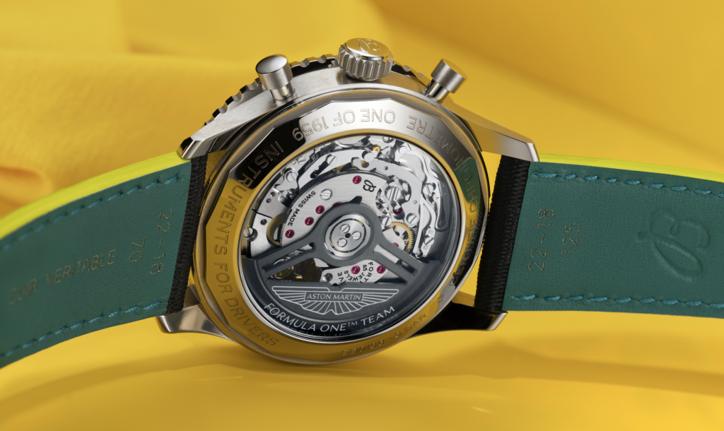 Le fond ouvert en saphir révèle le moteur de la montre : le Calibre Manufacture Breitling 01, un chronomètre certifié COSC avec une réserve de marche de 70 heures et conçu pour une précision de chronométrage absolue, même sous pression. Son rotor noir mat, développé spécialement pour cette édition, est en tungstène recouvert d’un revêtement PVD (physical vapor deposition) haute durabilité. Il arbore le logo Aston Martin Formula One Team. On peut aussi lire, gravés sur le fond du boîtier, les mots « One of 1959 » et « Instruments for Drivers ».