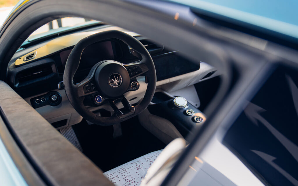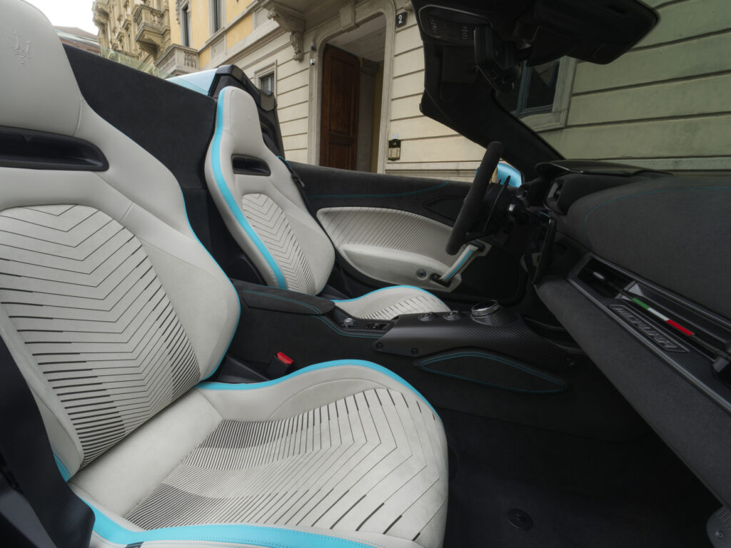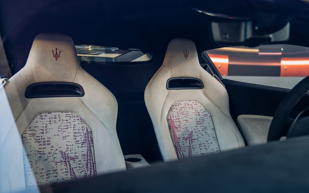 L’intérieur exclusif est bicolore, entièrement en Alcantara. Les sièges sont gravés au laser en Alcantara Glace et mettent en valeur le Trident avec un graphisme inédit.