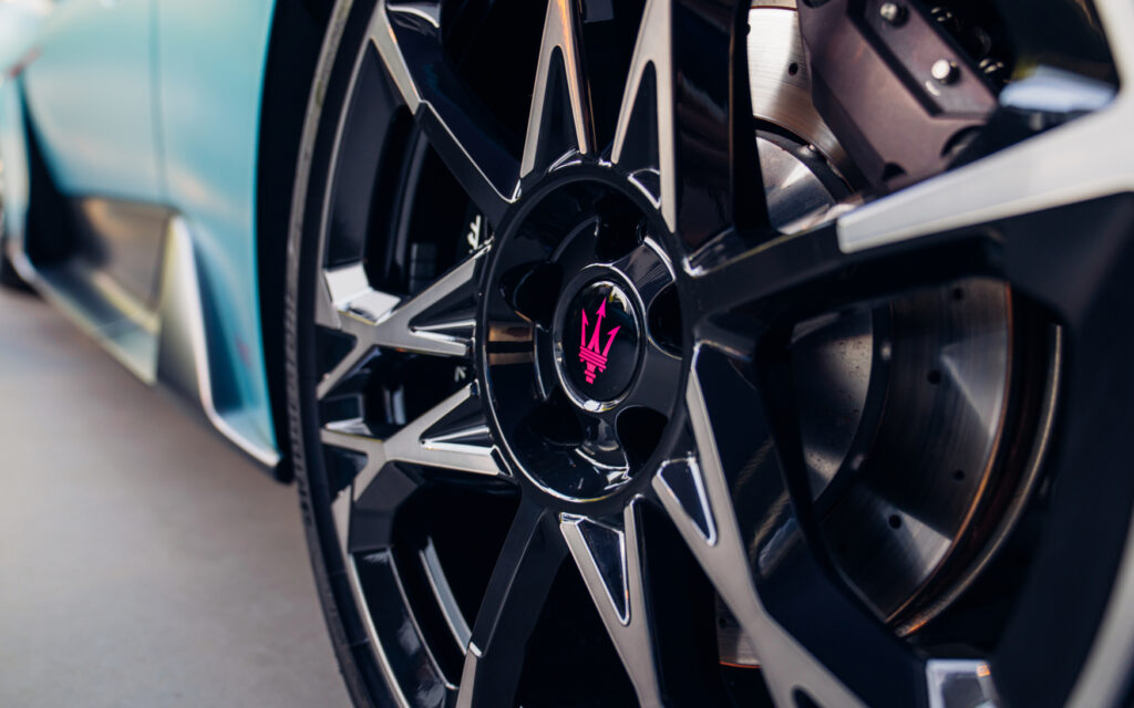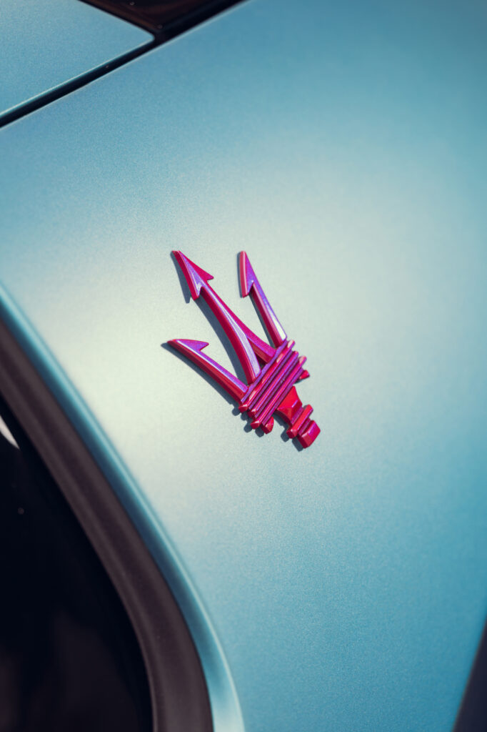Le trident, présent sur la calandre et le montant C, ainsi que les insignes des deux côtés de la voiture, sont, quant à eux, de couleur magenta et bleu mica, ce qui confère à l’ensemble une élégance supplémentaire, à l’instar du badge Fuoriserie apposé sur la partie inférieure arrière.