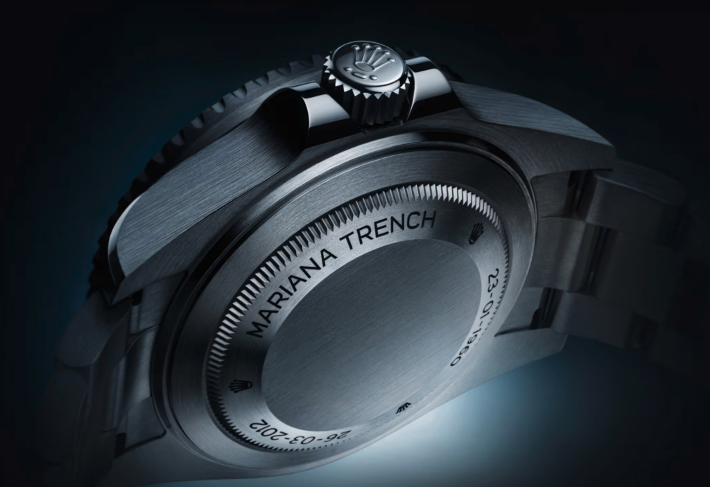 La Deepsea Challenge porte les mots « Mariana Trench » ainsi que les dates « 23-01-1960 » et « 26-03-2012 » gravées sur son fond. Ces mentions rendent hommage aux deux plongées historiques dans la fosse des Mariannes, la partie la plus profonde des océans : celle de l’océanographe Jacques Piccard et du lieutenant de l’US Navy Don Walsh à bord du bathyscaphe Trieste en 1960 et celle de James Cameron avec son submersible DEEPSEA CHALLENGER en 2012. Lors de chacun de ces deux exploits, une montre Rolex expérimentale était du voyage ; arrimée à l’extérieur du sous-marin, elle est remontée à la surface en parfait état de marche.