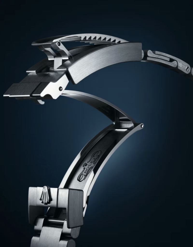 La Deepsea Challenge est assortie d’un bracelet Oyster à trois mailles. Équipé d’un fermoir de sécurité Oysterlock, conçu par Rolex, qui prévient toute ouverture involontaire, ce bracelet est pourvu du système de rallonge Rolex Glidelock, également mis au point par la marque et breveté. Sur le bracelet Oyster, cet ingénieux dispositif à crémaillère compte dix crans d’environ 2 mm chacun ; il permet de moduler sans effort la longueur du bracelet d’environ 20 mm. La montre peut ainsi être portée par‑dessus une combinaison de plongée d’une épaisseur pouvant atteindre 3 mm.