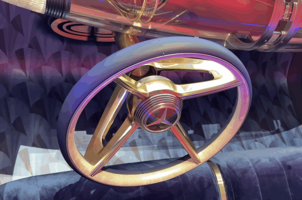 Le conducteur et le passager peuvent partager la banquette avant spacieuse et rembourrée en velours bleu, favorisant ainsi un sentiment de détente et d’expérience de luxe. Devant le conducteur, le volant à quatre branches met en valeur un caractère à la fois sportif et élégant. Le logo Mercedes-Benz flotte à l’intérieur d’une sphère de verre, serrée par les rayons comme un bijou. Le plancher du véhicule est revêtu d’une marqueterie élaborée, une technique décorative luxueuse datant du 17ème siècle et relancée dans les années 1920. Réalisée dans un motif Art déco classique en forme d’éventail, cette finition artisanale fait entrer l’art historique dans l’ère moderne.