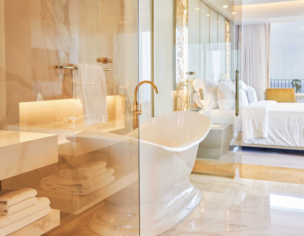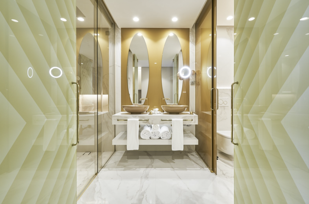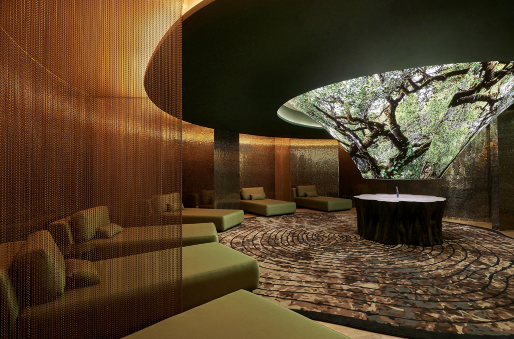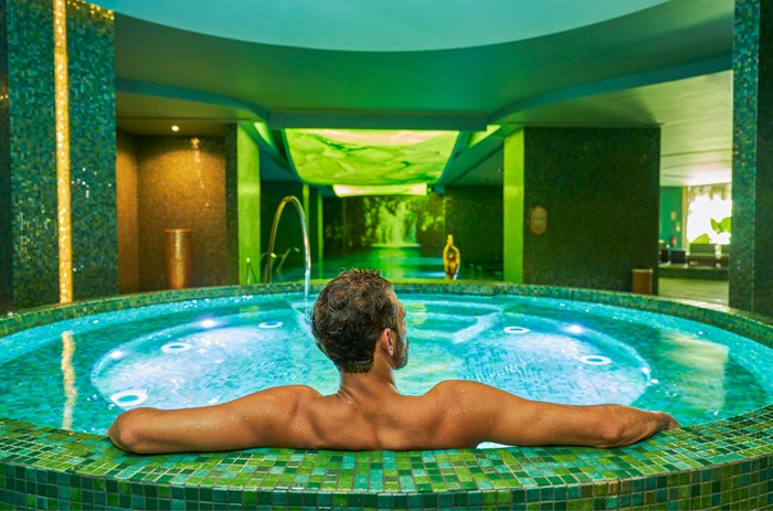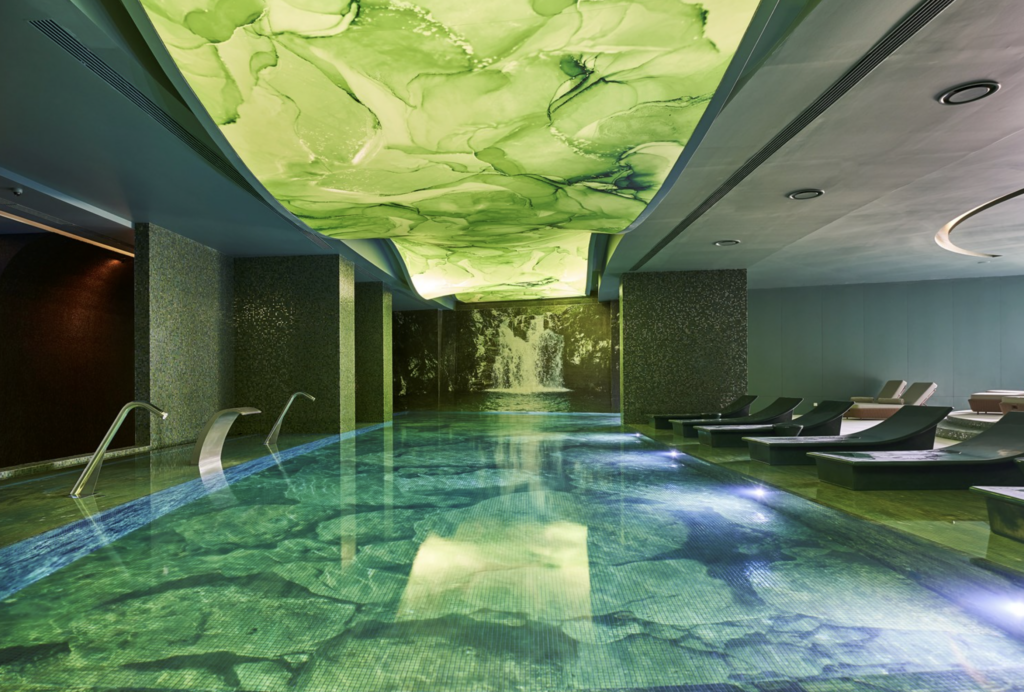 3100 m² – 13 cabines de soins – Sauna – Jacuzzi – Hammam – Fontaine de glace – Douches sensorielles – Piscine intérieure chauffée – Salle d’halothérapie – Salle de relaxation – Centre de fitness – Bar à champagne et manucure – Salon de beauté.